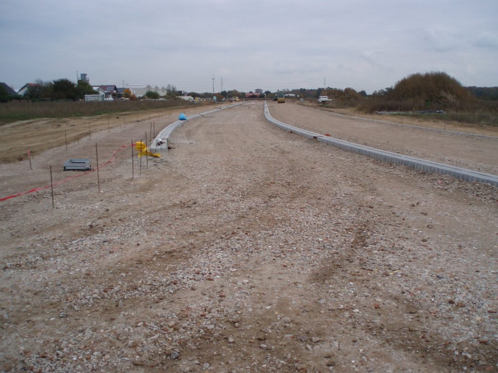 Baugebiet Gewerbegebiet II Büttelborn – Erschließung 20 ha, Bauzustand 2008, nach Einbau der ersten Lage Frostschutzschicht, Herstellung der Rundborde und der Rinne
