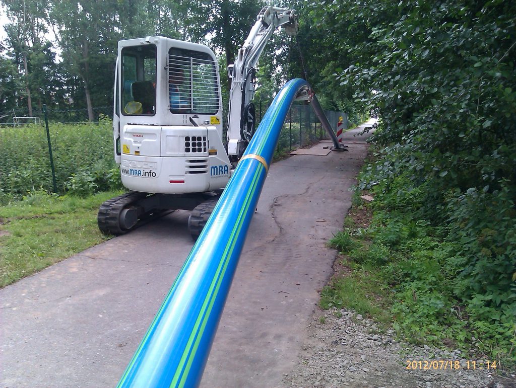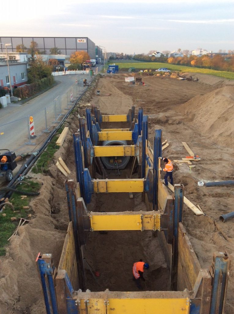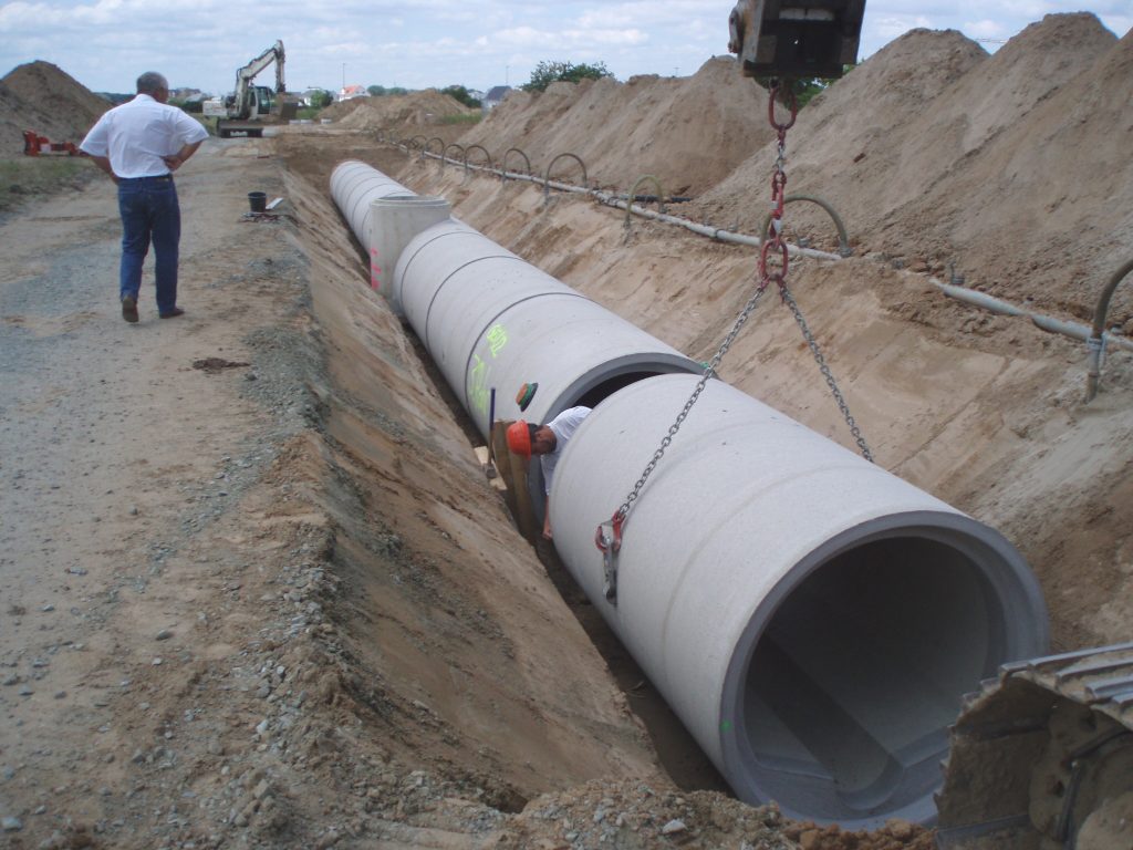 Baugebiet Gewerbegebiet II Büttelborn, Stahlbetonprofilrohr DN 1400 mit Trockenwetterrinne DN 350, Grundwasserabsenkung, Wiederverfüllung der oberen Bettungsschicht mit fließfähigem Verfüllbaustoff