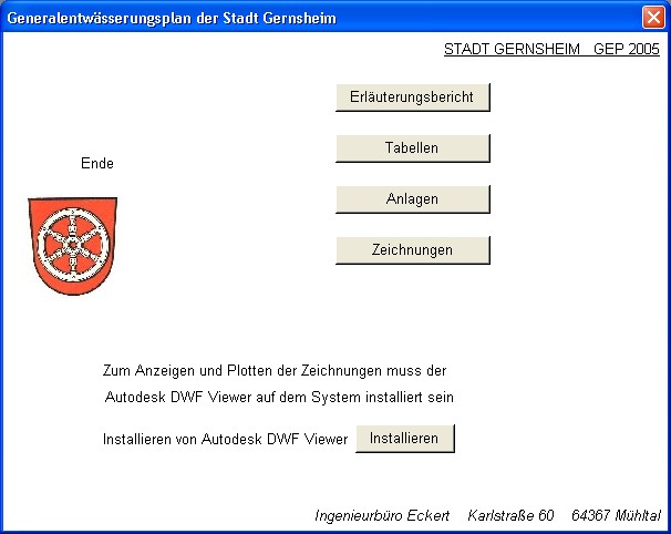 Stadt Gernsheim - Generalentwässerungsplan 2005, Startbildschirm, Alle Berichte, Tabellen, Anlagen und Zeichnungen zentral auf CD-ROM verfügbar